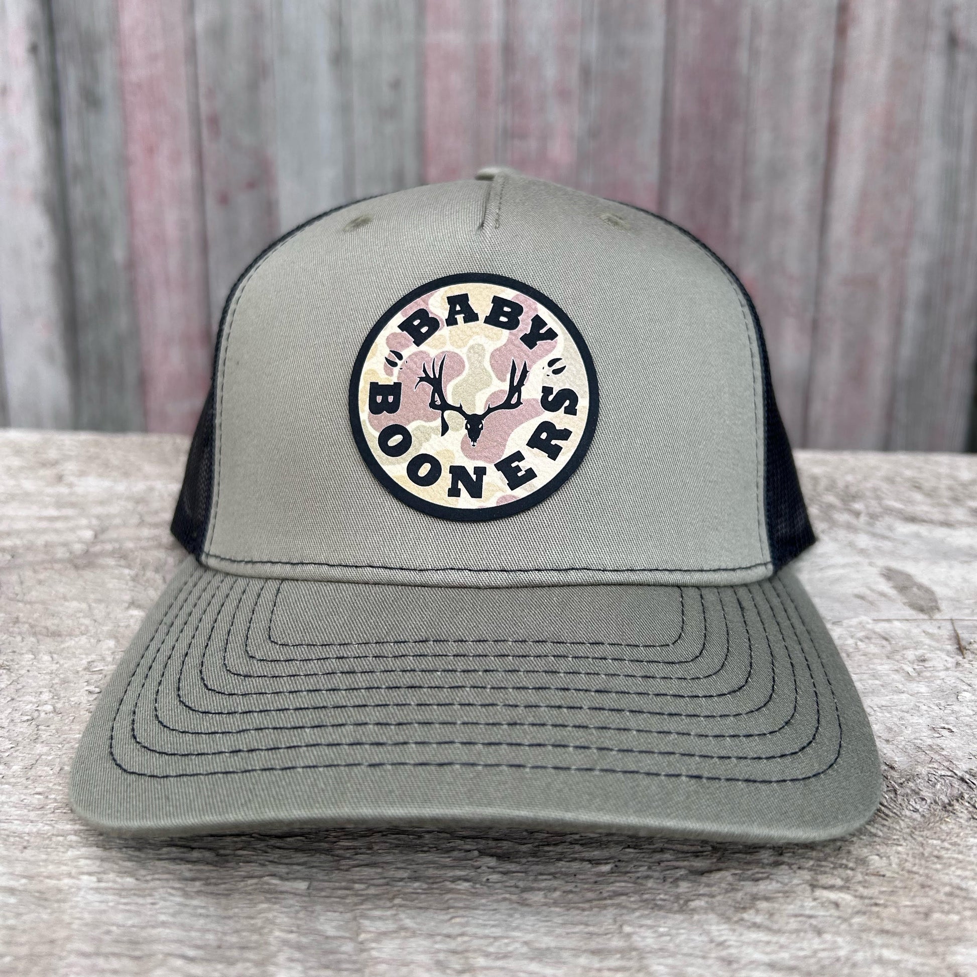 Baby Booners Green/Black Camo Patch Hat. (Richardson -112FP snapback hat)